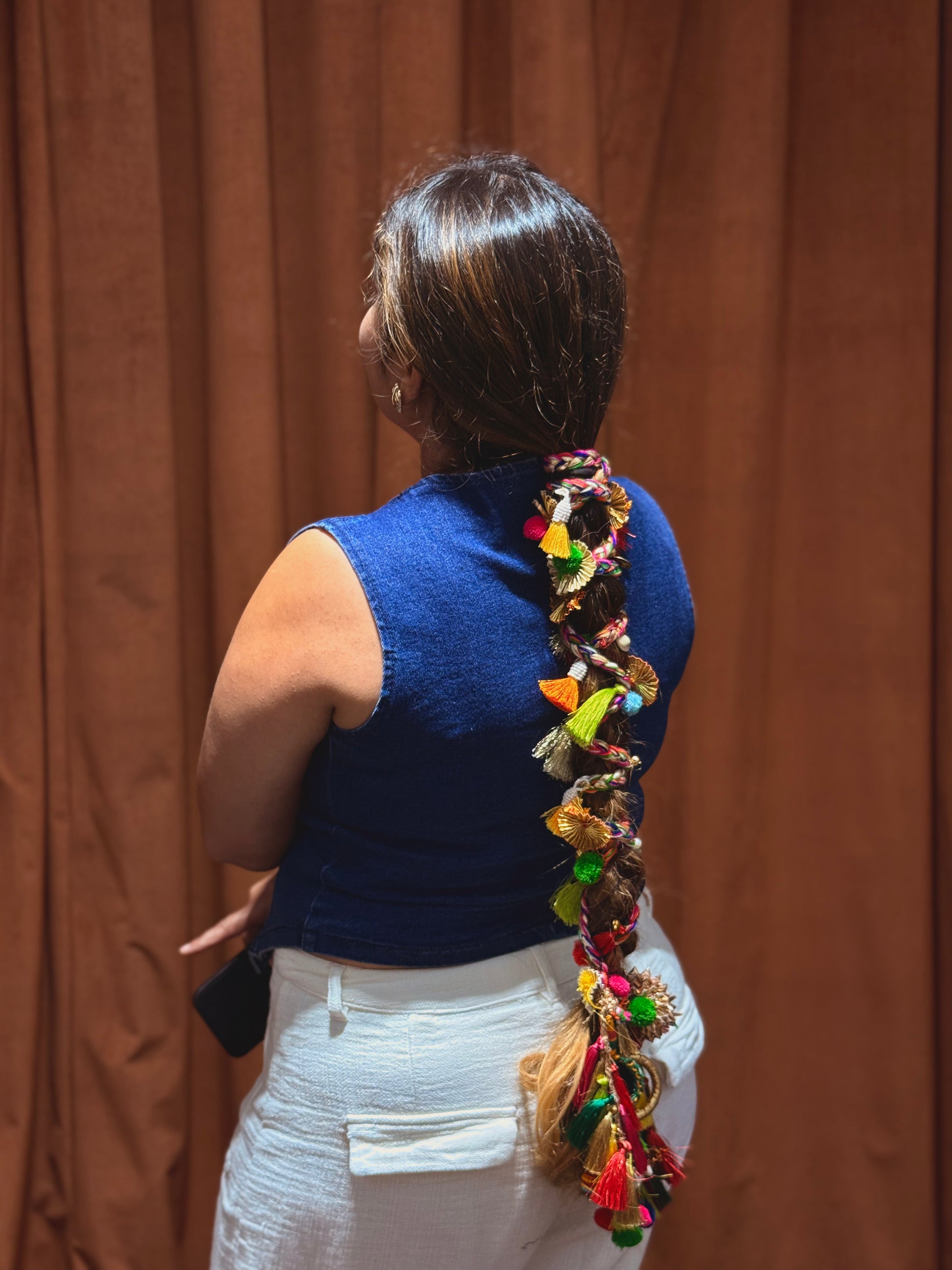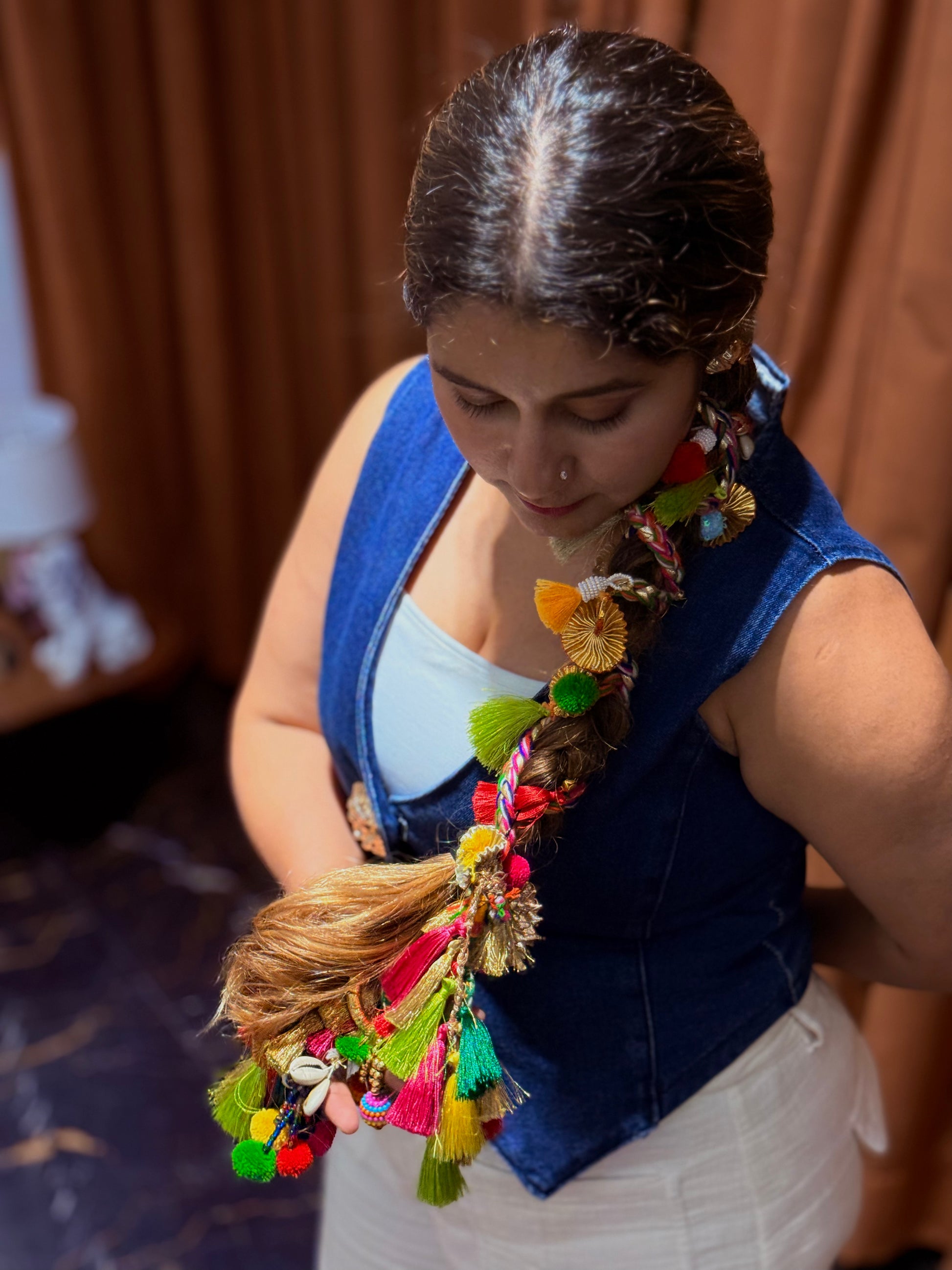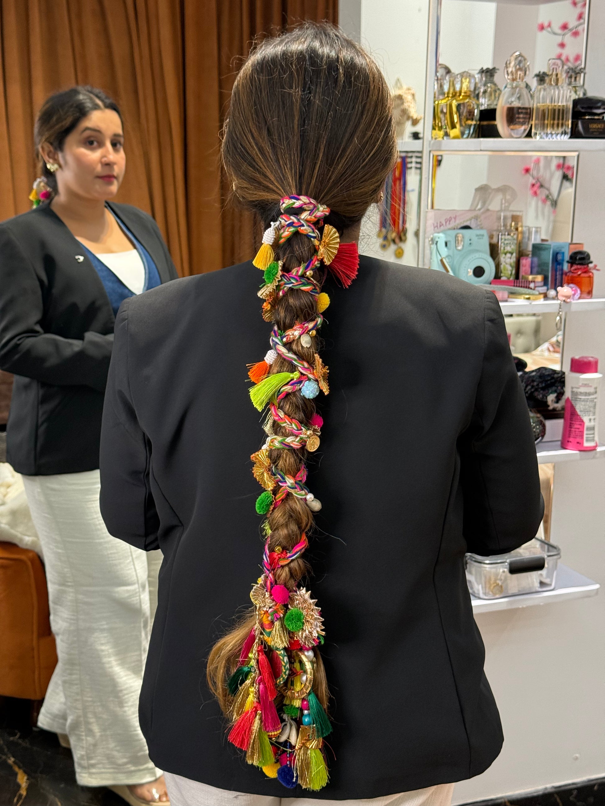 Celebrate the colors of life with our Rangrez Parandi. Bursting with vibrant threads, playful tassels, and eclectic charms, this parandi is designed for the free spirit who loves to stand out. Whether it’s a mehndi night, a festive gathering, or a casual boho look, this piece instantly transforms your braid into a work of art full of joy and personality.