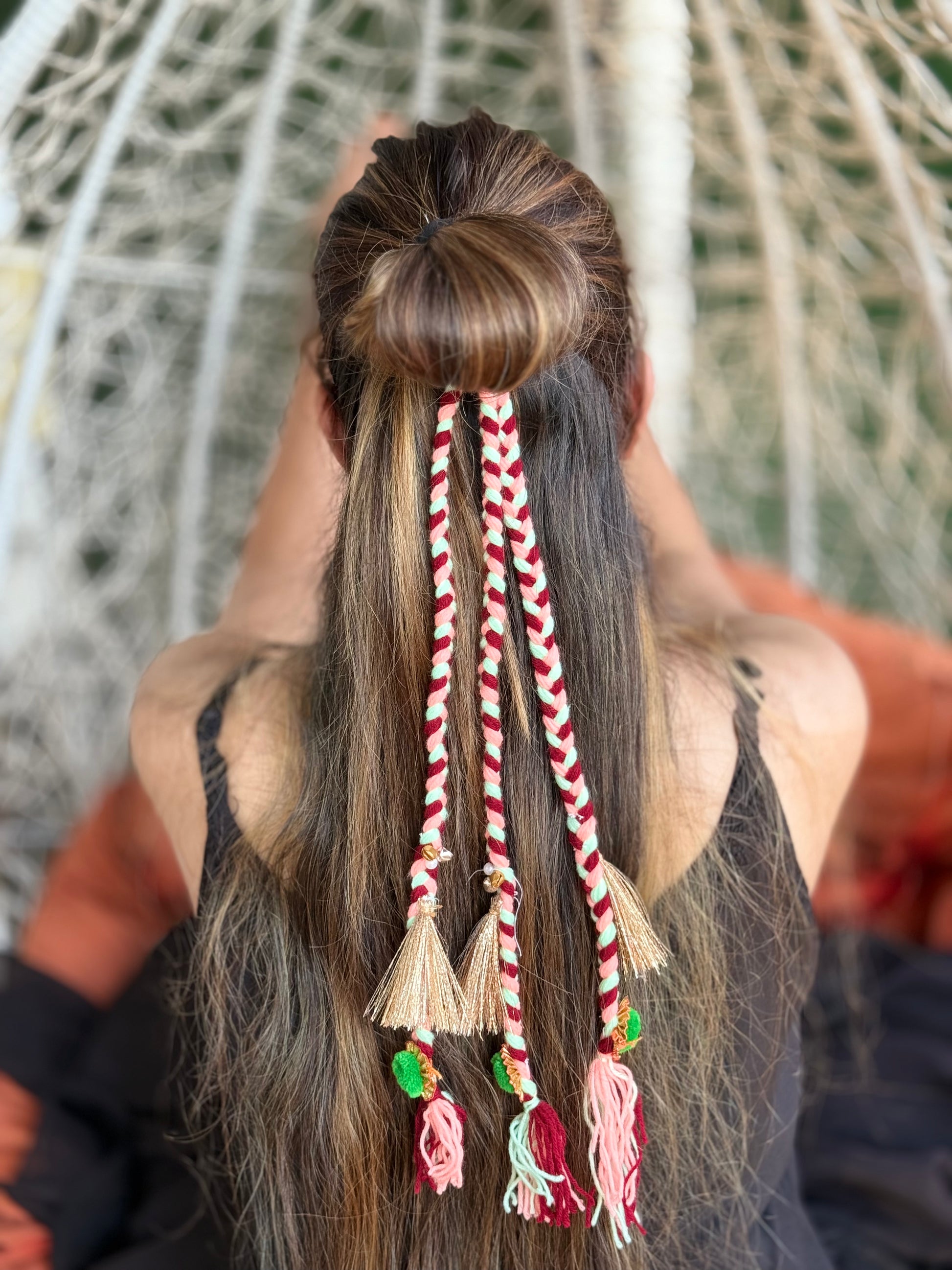 A timeless red and ivory braid set, decorated with golden tassels and thread details. This accessory combines festive spirit with classic elegance, perfect for traditional events or chic modern looks.